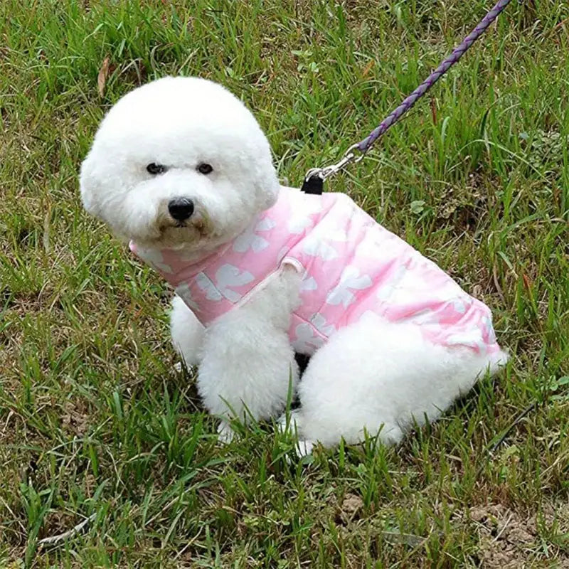 Keep your furry friend cozy and adorable with this playful pink Bow Jacket. Designed for both dogs and cats, it features a charming bow print and a warm winter vest style to beat the chill. The convenient leash clip lets you take your pet on strolls with ease, while the snug fit keeps them comfortable and stylish all season long. Perfect for adding a splash of fun to your pet’s cold-weather wardrobe!