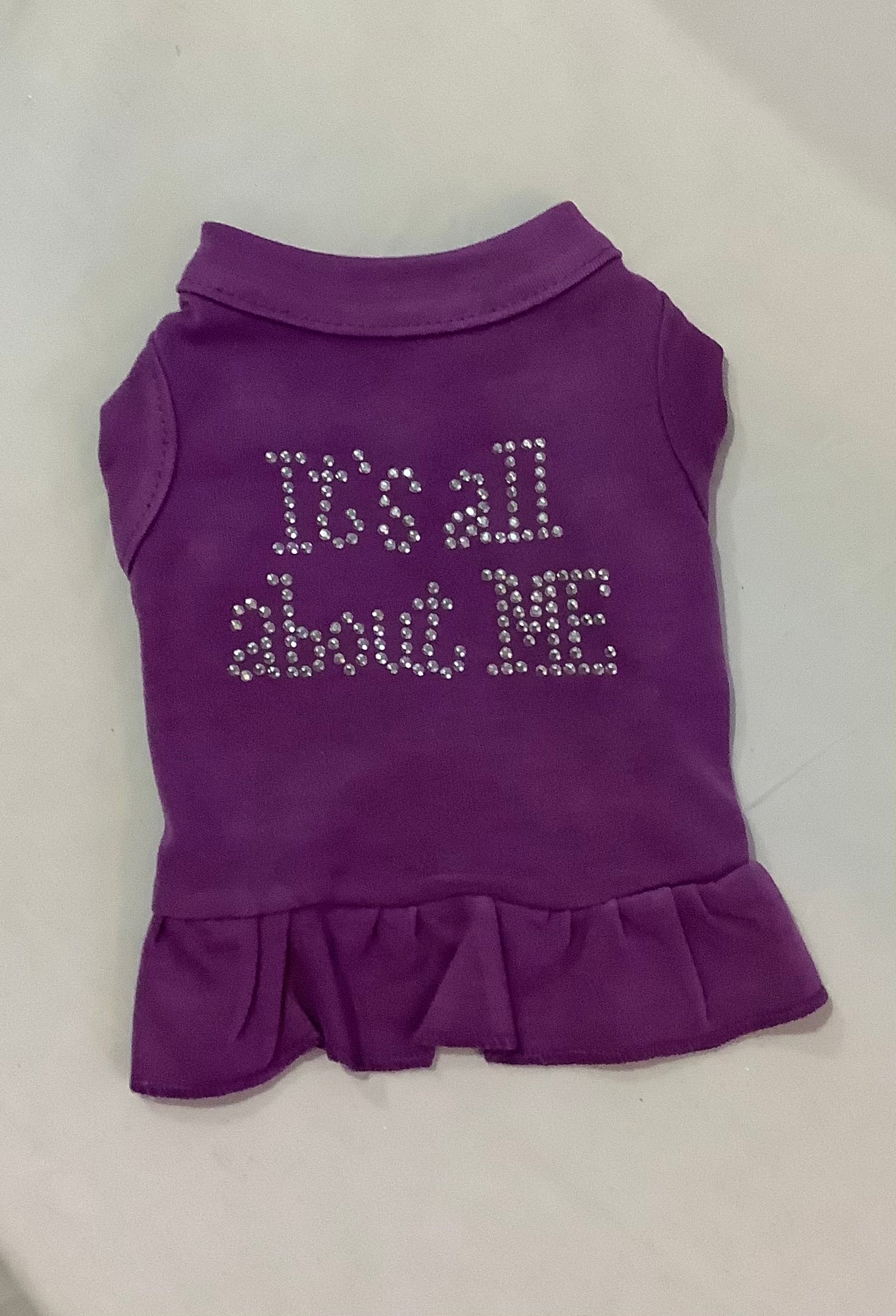 Stay cool and looking fab in this "It's all about ME" dress! A perfect blend of poly and cotton with double-stitched comfort and durability, it's also got a ruffle sewn onto the bottom for that extra feminine flair - not to mention the totally rad rhinestone detailing! So flaunt it and show the world who the star of the show is: you!
